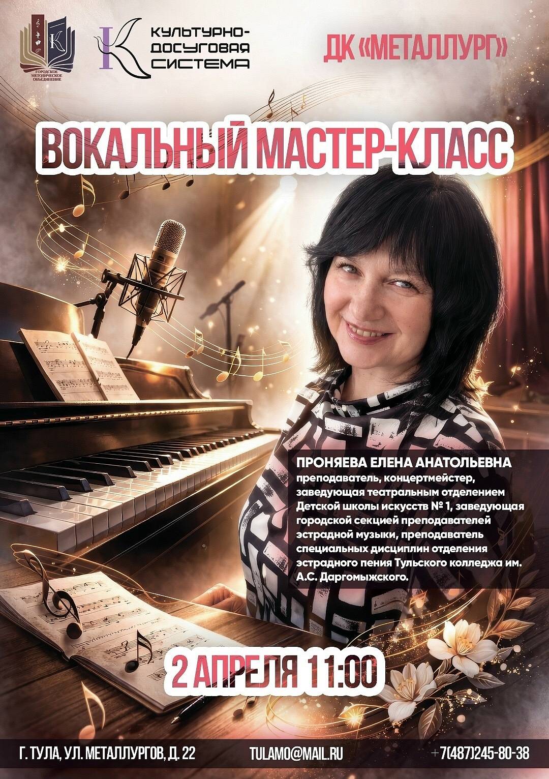 02.04.2026 Просмотров: 632 апреля в ДК «Металлург» по приглашению городского методического объединения МАУК «Культурно- досуговая система» преподаватель нашей школы Елена Анатольевна Проняева провела мастер-класс «Методики и техники современного вокала». На мастер-классе обзорно разобрали и попрактиковали некоторые известные и популярные современные вокальные методики: SLS ( Speach Level Singing), EVT ( Estill Voice Training), CVT (Complete Vocal Techigue), авторский метод Шерил Портер. В мастер-классе приняли участие руководители вокальных коллективов и солисты МАУК «Культурно- досуговая система»!