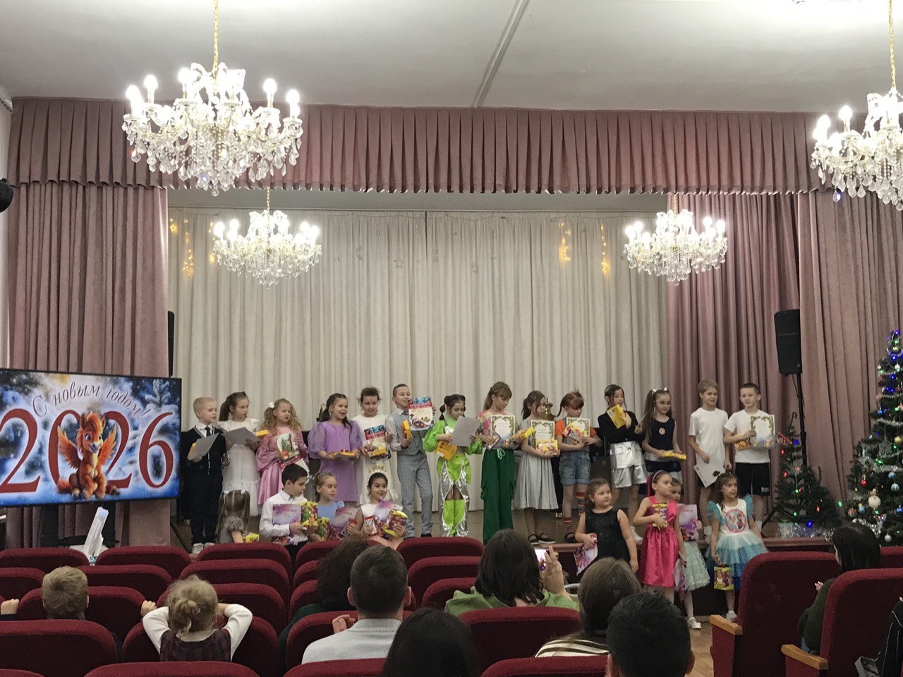 27.12.2025 Просмотров: 39327 декабря в концертном зале школы было шумно и весело. На сцене для своих родителей выступали юные артисты музыкально-театральных групп Образцового коллектива ДМТ "Синяя птица". Продолжили концертную программу группы "Бусинки", "Котята" и "Бельчата": дети пели, танцевали, были показаны три спектакля ("Мойдодыр", " Я однажды ненароком", "Пеппи в цирке").