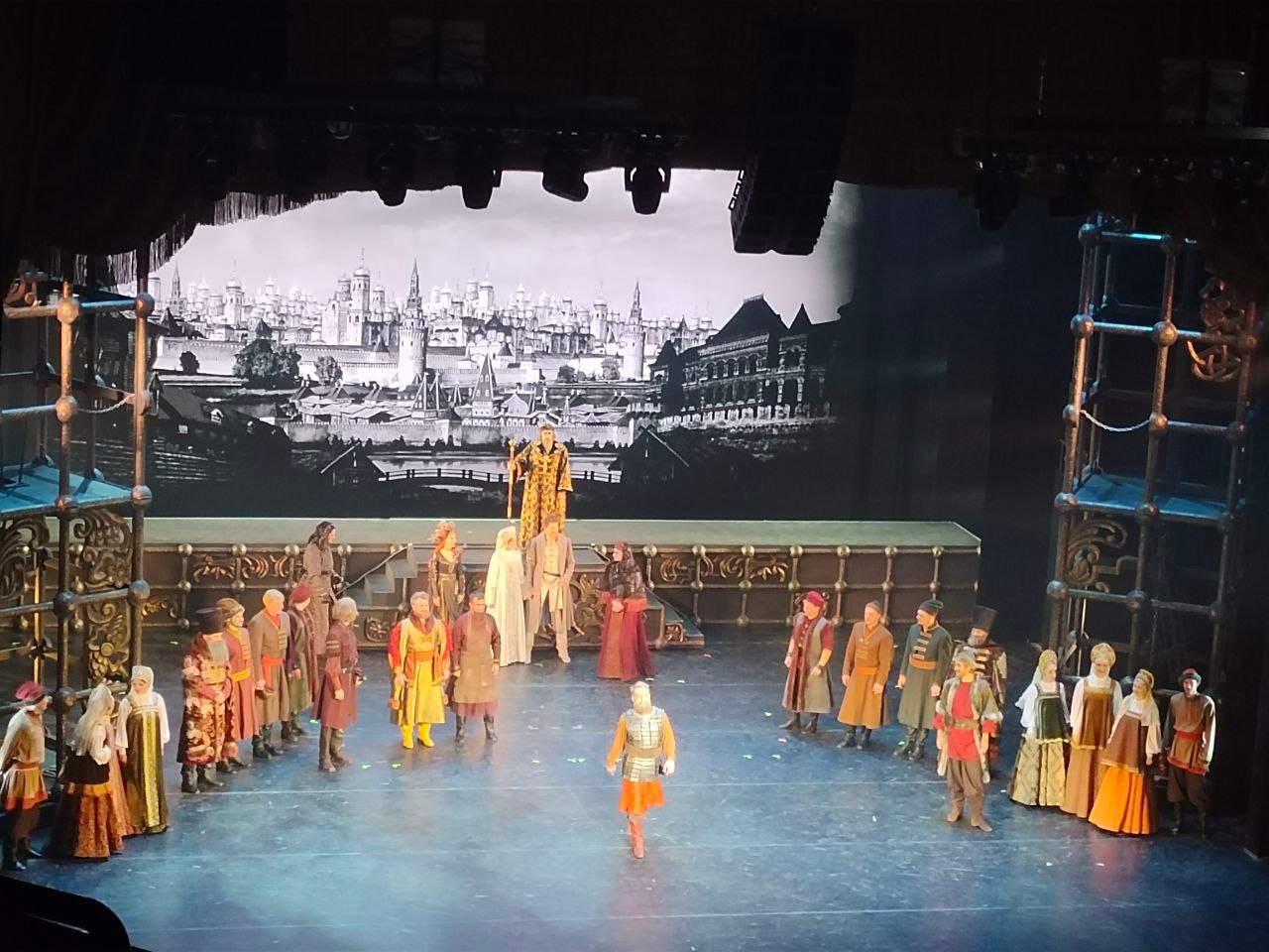 Исторические события времен царствования Ивана Грозного - это повод для учащихся обогатить свои знания истории, а для взрослых освежить в памяти события тех лет. Зрителей восхитили грандиозные декорации, богатое убранство костюмов, эффектные видеопроекции, прекрасные голоса и актерская игра певцов, балетные сцены, звучание оркестра, замечательная музыка Аркадия Укупника! Отрадно, что мальчики хора "Камертон", юные художники и артисты школьного музыкального театра "Синяя птица" увидели образец высокого искусства! Наши театралы искренне благодарят туристическую фирму "Меридиан" за возможность посетить Театр Оперетты и получить массу положительных эмоций от просмотра спектакля, за прекрасную организацию и содержательную экскурсию!