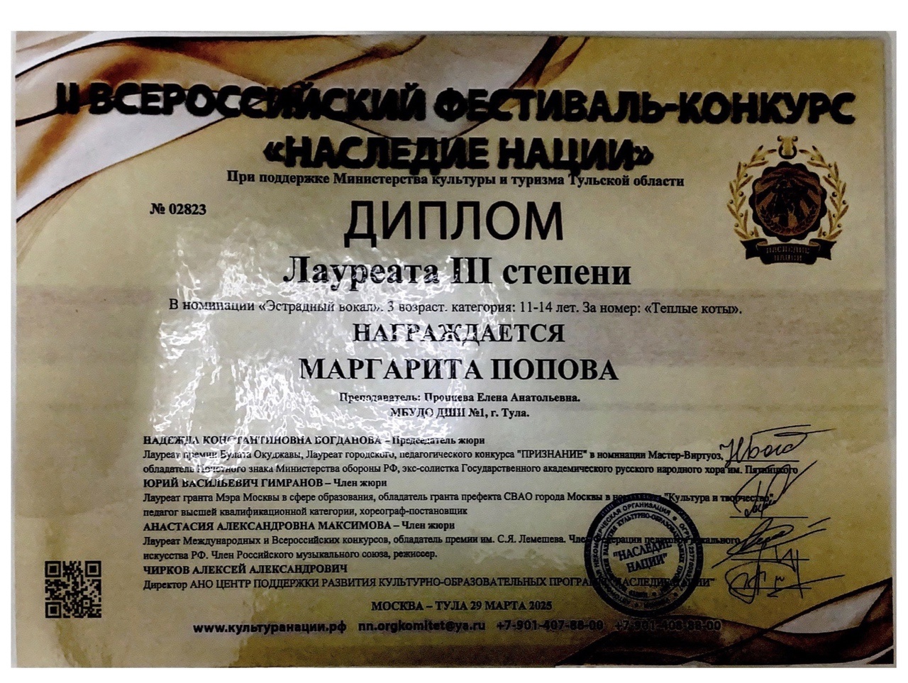 фестиваль - конкурс «Наследие нации». Поздравляем Маргариту Попову