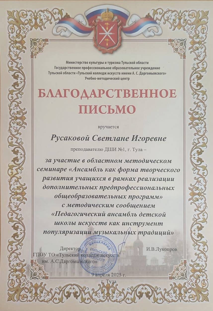 14 апреля 2025, Понедельник 12:04 Просмотров: 4229 апреля 2025 г. в ДШИ №4 г. Тулы состоялся областной методический семинар «Ансамбль как форма творческого развития обучающихся в рамках дополнительных предпрофессиональных общеобразовательных программ». В семинаре с методическим сообщением «Педагогический ансамбль детской школы искусств как инструмент популяризации музыкальных традиций» приняла участие заведующая народным отделением нашей школы (секция баян, аккордеон) Светлана Игоревна Русакова.
