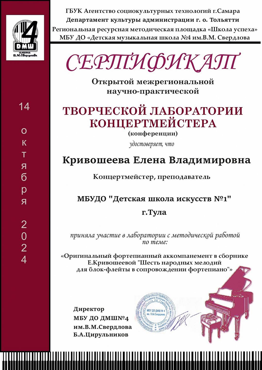 Благодарим преподавателя и концертмейстера нашей школы Елену Владимировну Кривошееву за участие в открытой межрегиональной научно-практической ТВОРЧЕСКОЙ ЛАБОРАТОРИИ КОНЦЕРТМЕЙСТЕРА (конференции).