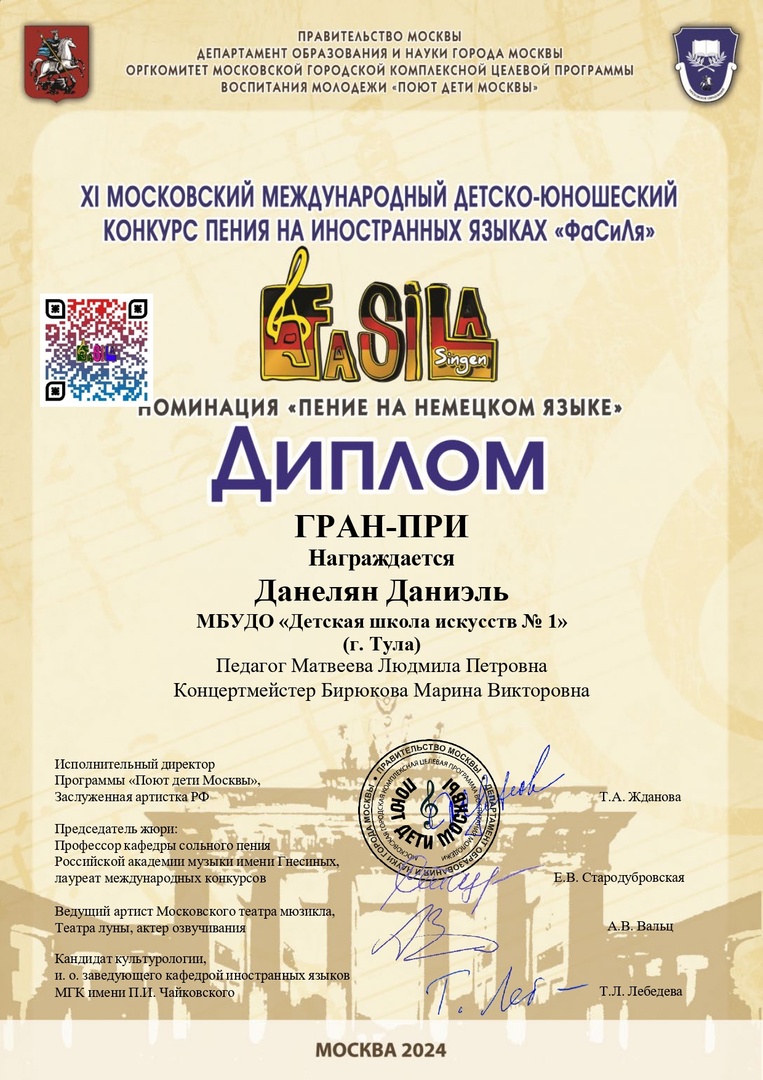 Поздравляем обладателя ГРАН-ПРИ XI Московского Международного детско-юношеского конкурса пения на иностранных языках "Fasila" ("ФАСИЛЯ") Даниэля Данеляна, преподаватель Людмила Петровна Матвеева, концертмейстер Марина Викторовна Бирюкова!