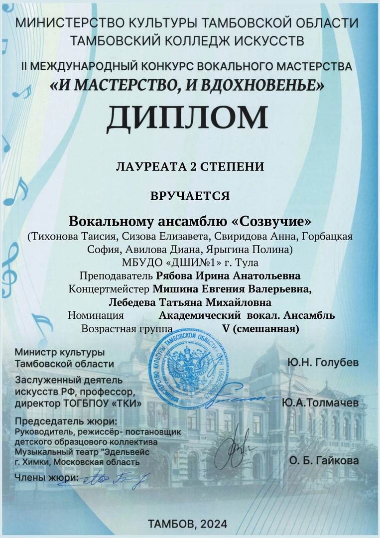 26 марта 2024, Вторник 07:03 Просмотров: 647Поздравляем Лауреата II степени II Международного конкурса вокального мастерства "И мастерство, и вдохновенье" вокальный ансамбль "Созвучие" (Таисия Тихонова, Елизавета Сизова, Анна Свириденкова, София Горбацкая, Диана Авилова, Полина Ярыгина), преподаватель Ирина Анатольевна Рябова, концертмейстеры Евгения Валерьевна Мишина, Татьяна Михайловна Лебедева!
