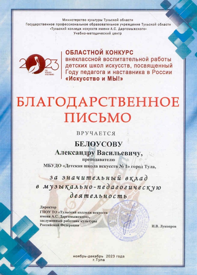 Благодарственным письмом «За значительный вклад в музыкально-педагогическую деятельность» был награждён преподаватель нашей школы Александр Васильевич Белоусов.