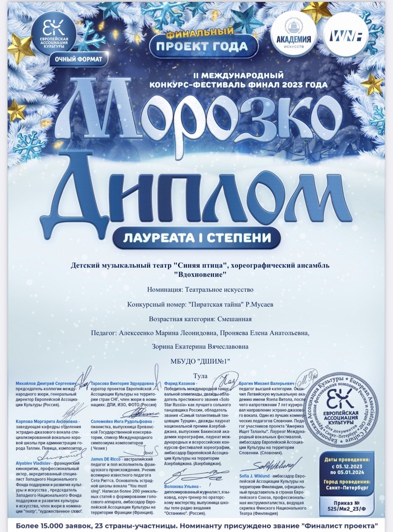 Поздравляем Образцовый коллектив Детский музыкальный театр «Синяя птица» (при участии Образцового хореографического ансамбля "Вдохновение") с Дипломом лауреата 1 степени II Международного конкурса- фестиваля «Морозко»!