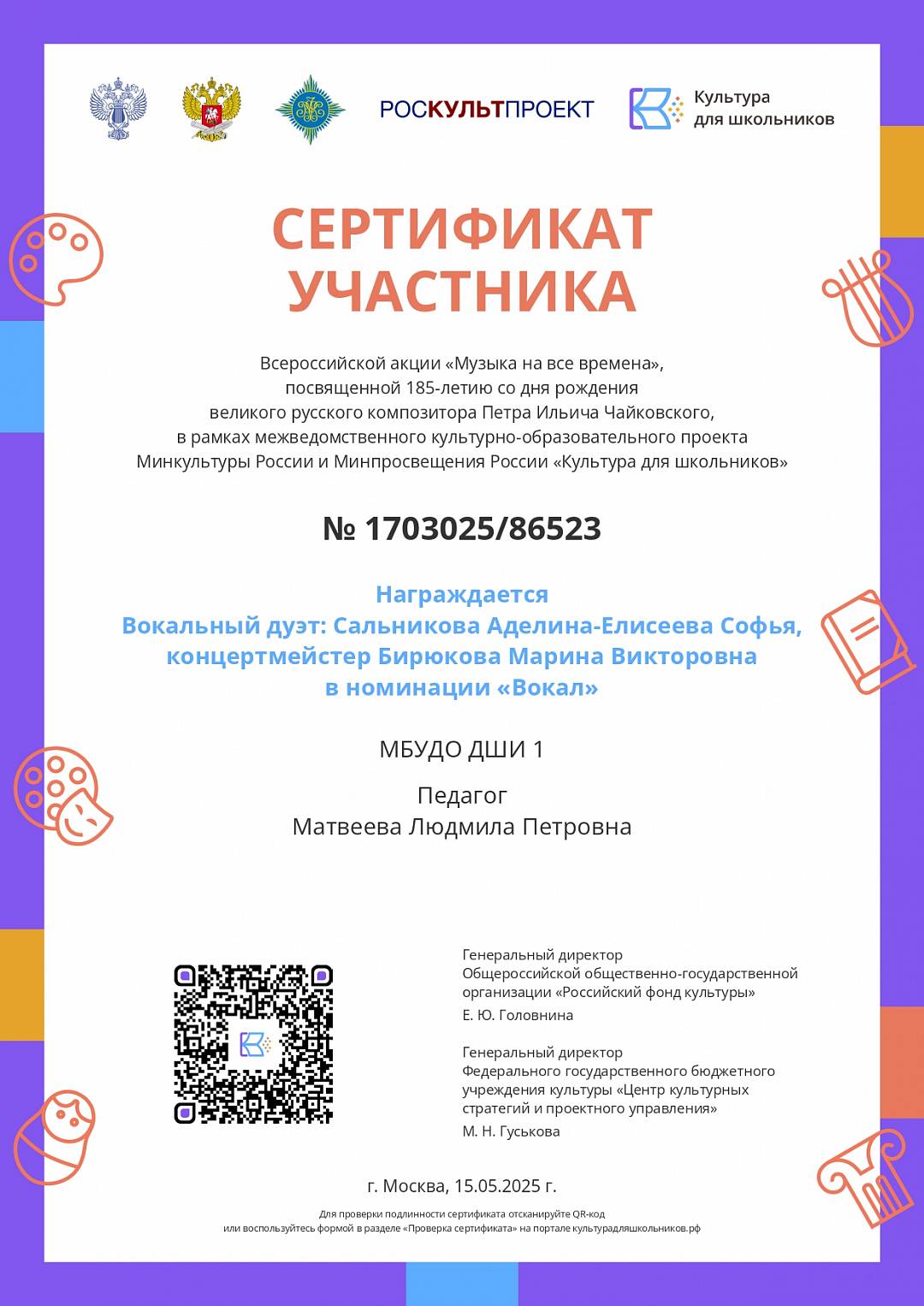 20 мая 2025, Вторник 12:05 Просмотров: 312Поздравляем и благодарим вокальный дуэт: Аделина Сальникова и Софья Елисеева (преп. Матвеева Л.П.. конц. Бирюкова М.В.) - участников Всероссийской акции «Музыка на все времена» проекта «Культура для школьников».