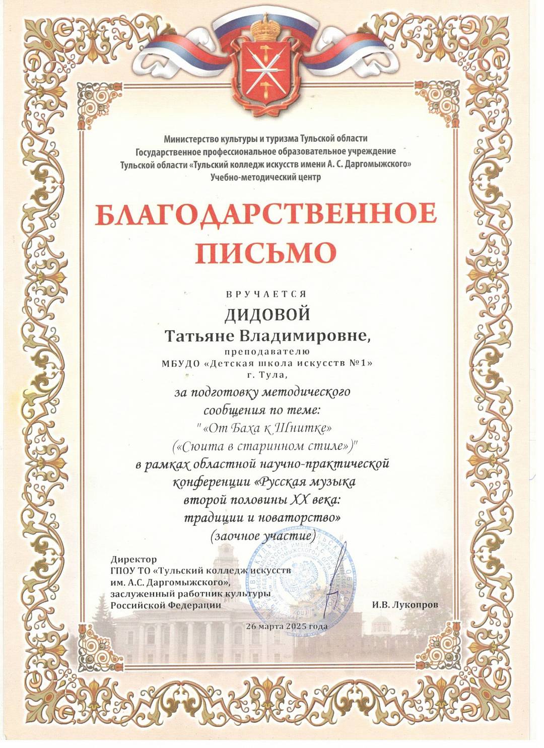 8 апреля 2025, Вторник 12:04 Просмотров: 580Областная научно-практическая конференция состоялась 26 марта 2025 года в Камерном зале Новомосковского музыкального колледжа имени М.И. Глинки.