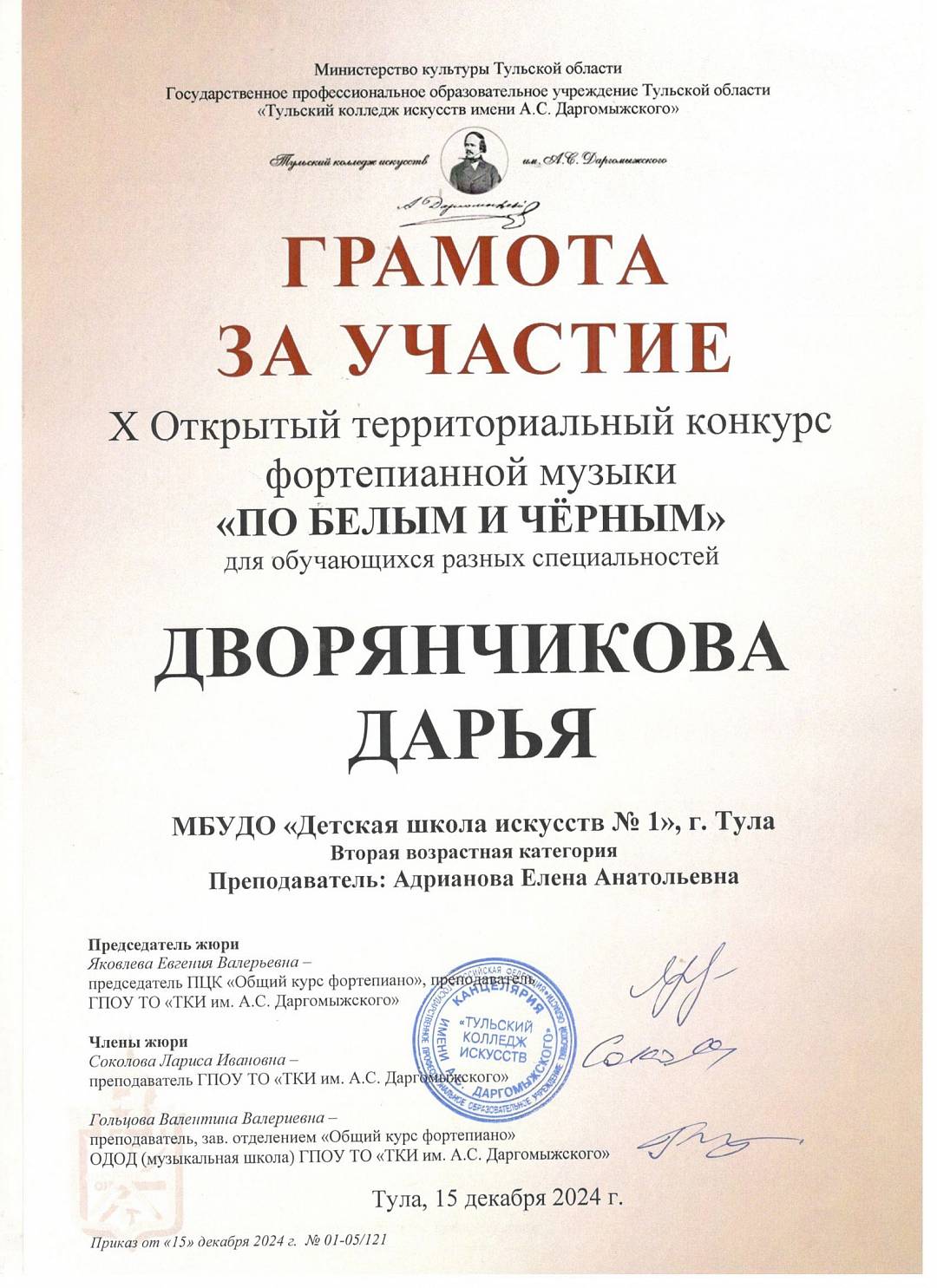 БЛАГОДАРИМ участника конкурса Дворянчикову Дарью, преподаватель Адрианова Е.А.!