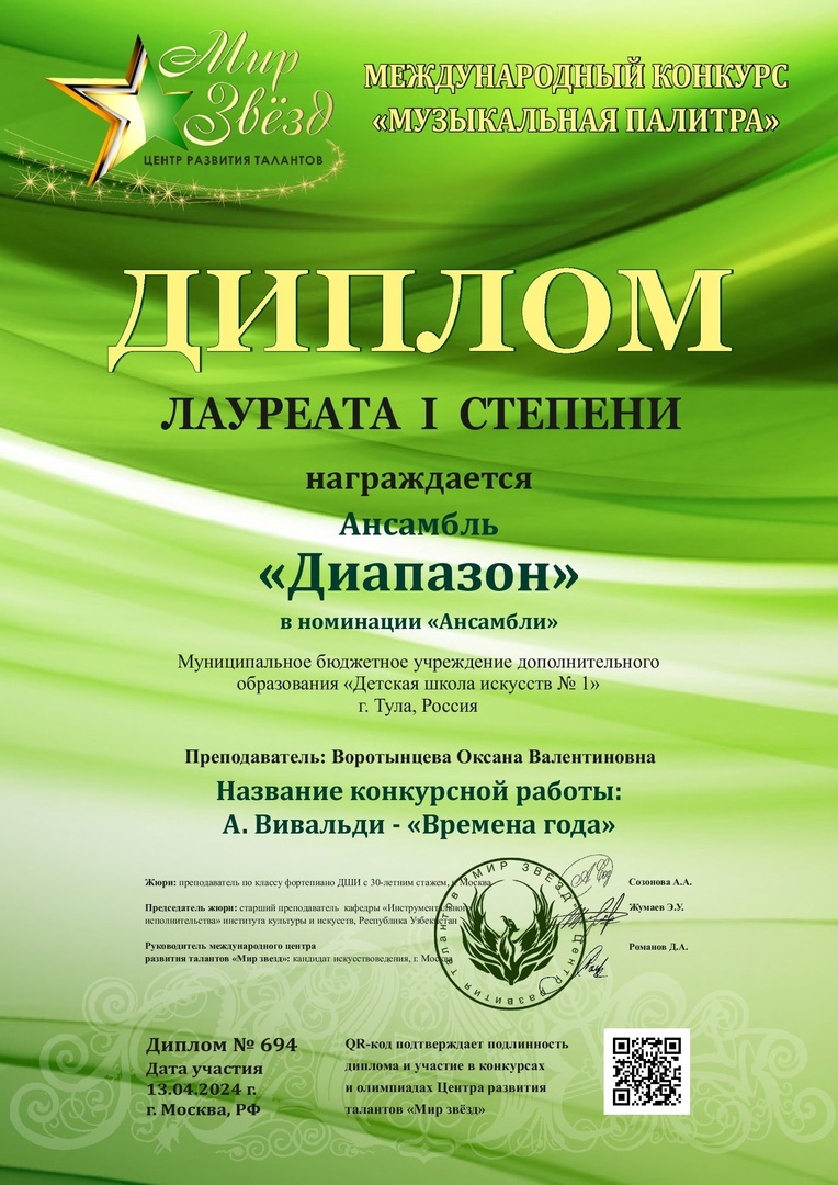 Воротынцева, с Дипломом лауреата I степени Международного конкурса «Музыкальная