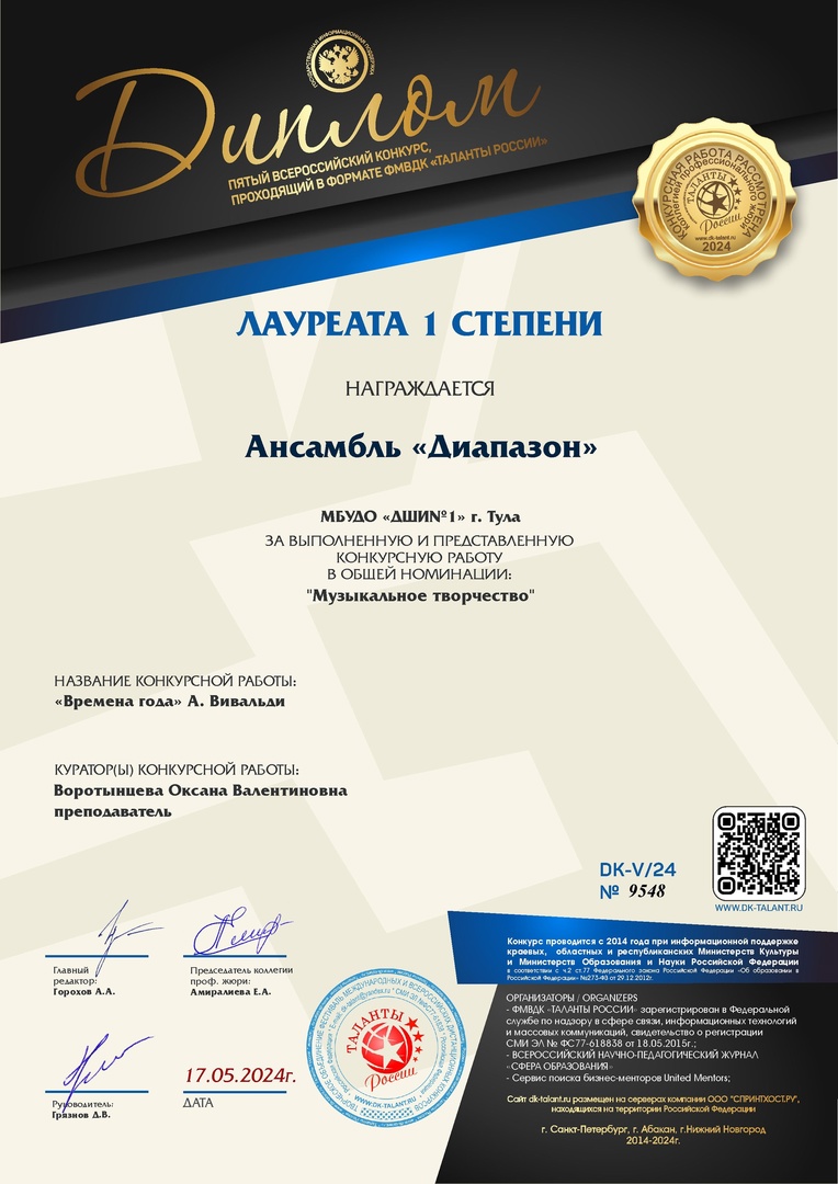 29 мая 2024, Среда 11:05 Просмотров: 631Поздравляем ансамбль гитаристов «Диапазон» (Кузьминов Владимир, Трунов Дмитрий, Мусаев Артём, Зардынова Алёна, Кочережников Иван, Андреева Полина, Андреева София, Переведенцева Евгения, Гераськина Елизавета, Макаров Игорь), преподаватель Оксана Валентиновна Воротынцева, с Дипломом лауреата I степени Пятого Всероссийского конкурса «Таланты России»!