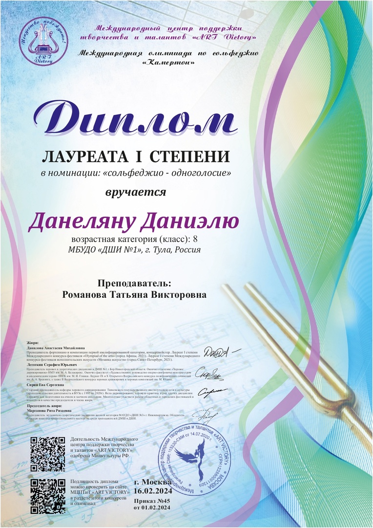 Поздравляем Даниэля Данеляна Лауреата I степени Международной олимпиады по сольфеджио "Камертон"