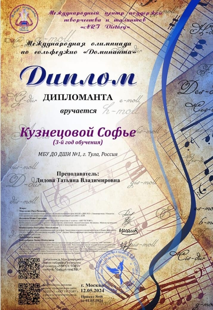 Поздравляем Дипломанта Международной олимпиады по сольфеджио "Доминанта" Софью Кузнецову