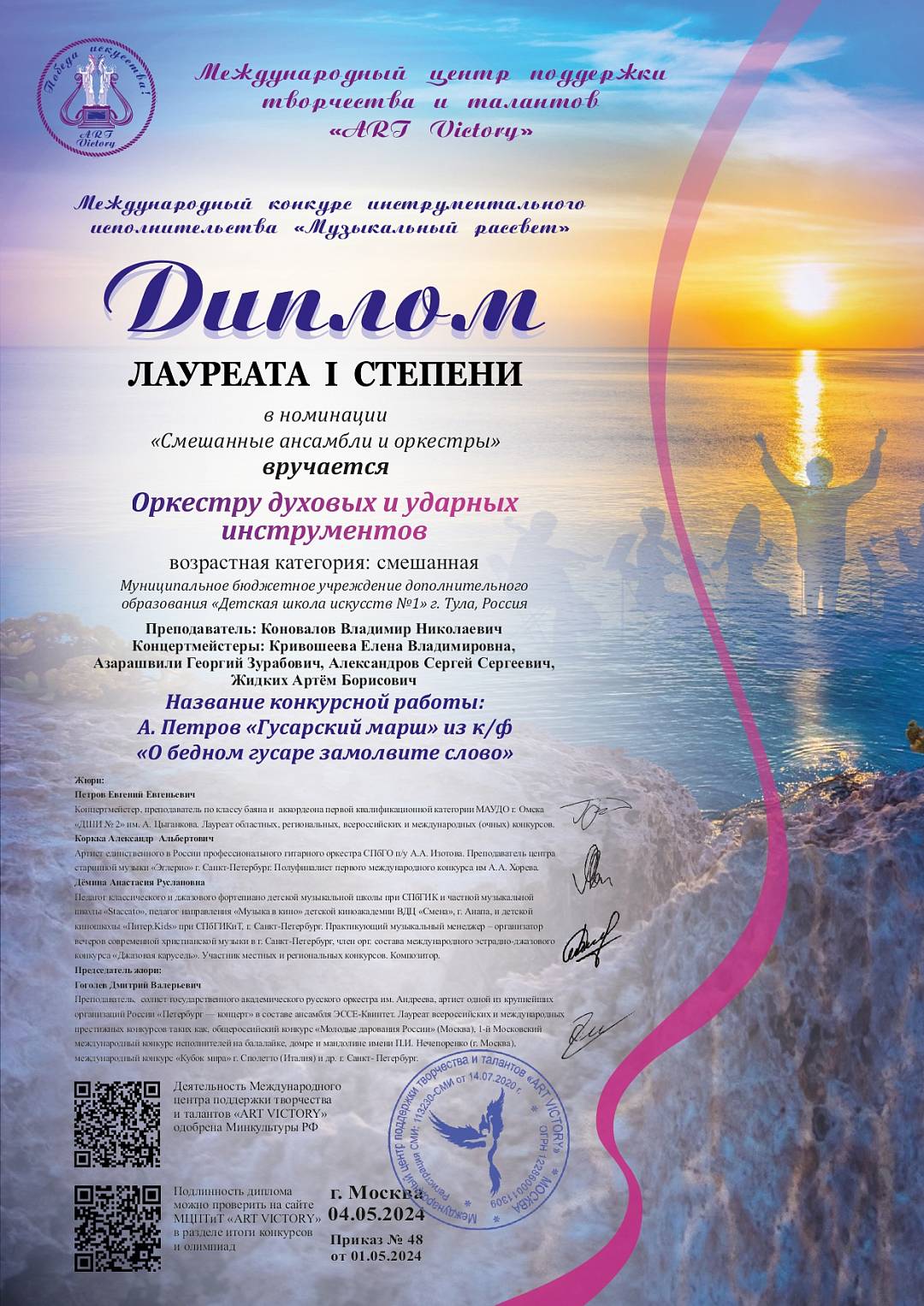 Поздравляем духовой оркестр с Дипломом лауреата I степени Международного конкурса инструментального исполнительства "Музыкальный рассвет"!