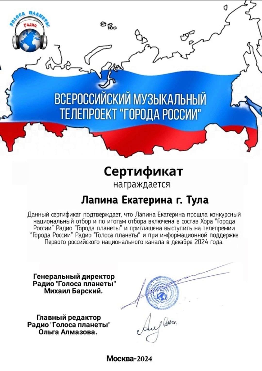 Поздравляем Екатерину Лапину с успешным прохождением 1 этапа кастинга в хор «Города России»!