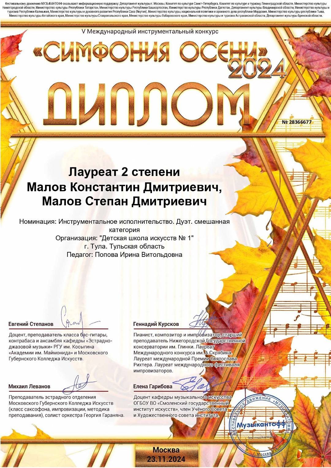 10 декабря 2024, Вторник 02:12 Просмотров: 403ПОЗДРАВЛЯЕМ Лауреата 2 степени V Международного инструментального конкурса "Симфония осени" фортепианный дуэт Константина и Степана Маловых (преподаватель Попова И.В. )!