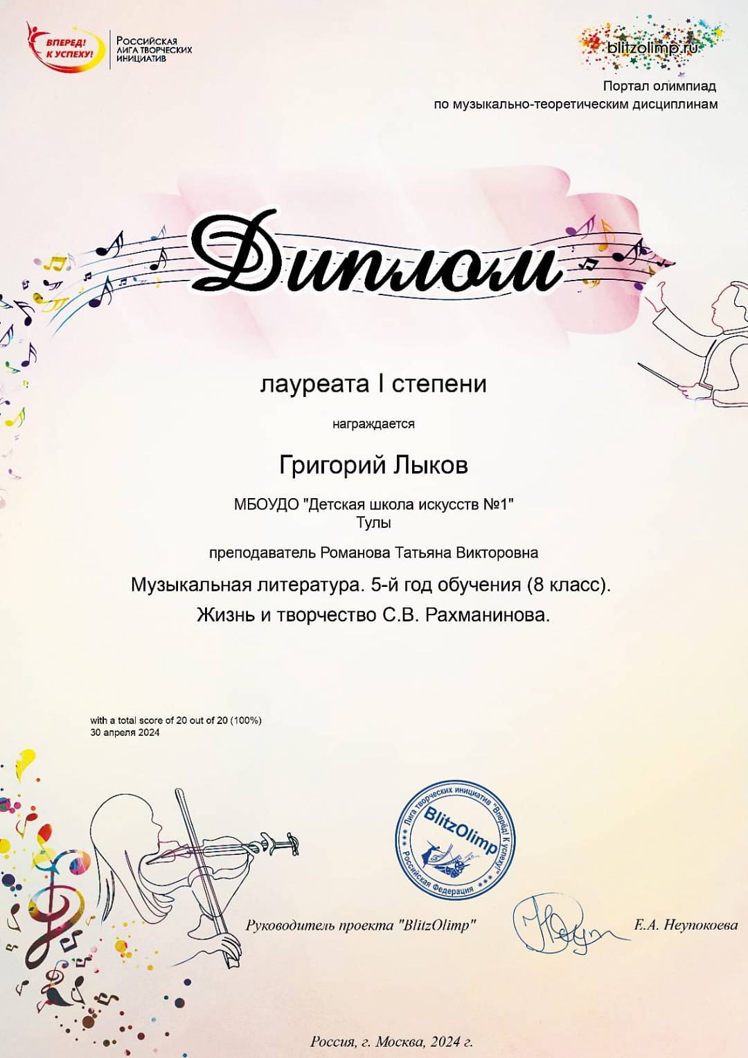 Поздравляем Григория Лыкова, преподаватель Татьяна Викторовна Романова,