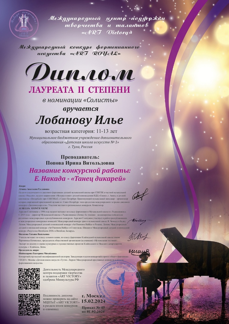 Витольдовна Попова) с Дипломом лауреата II степени Международного конкурса