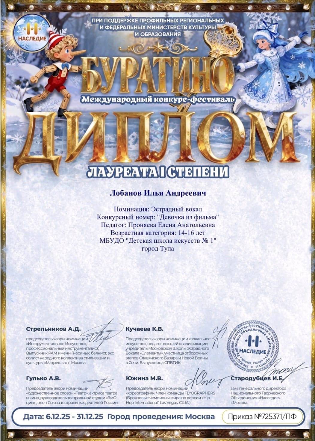 29 декабря 2025, Понедельник 12:12 Просмотров: 95Поздравляем Илью Лобанова (преподаватель Елена Анатольевна Проняева) с Дипломом лауреата 1 степени Международного конкурса- фестиваля «Буратино»!
