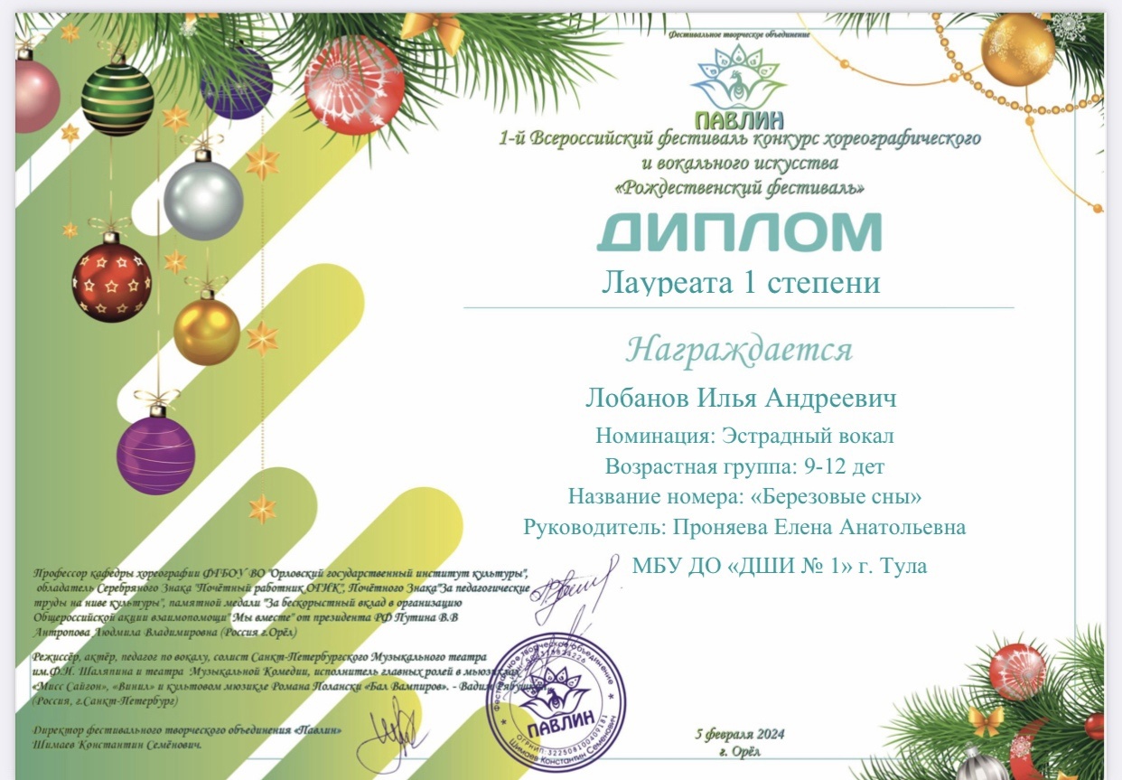 Поздравляем Илью Лобанова (преподаватель Елена Анатольевна Проняева) с Дипломом лауреата 1 степени I Всероссийского фестиваля- конкурса хореографического и вокального искусства «Рождественский фестиваль»!