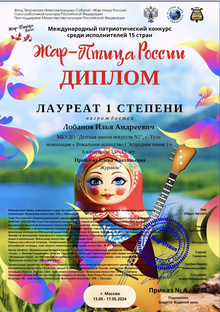 Поздравляем Илью Лобанова с Дипломом лауреата 1 степени конкурса «Жар - Птица России»