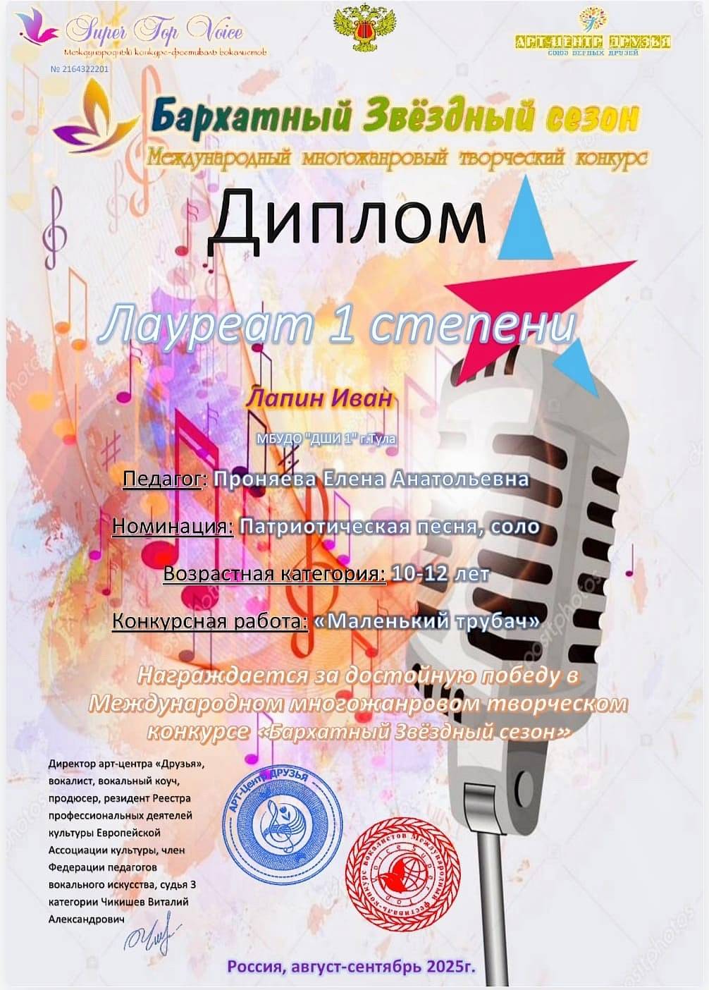 13 октября 2025, Понедельник 12:10 Просмотров: 151Поздравляем Ивана Лапина (преподаватель Елена Анатольевна Проняева) - Лауреата 1 степени в номинациях «Патриотическая песня» и «Эстрадный вокал» Международного многожанрового творческого конкурса «Бархатный Звездный сезон»!