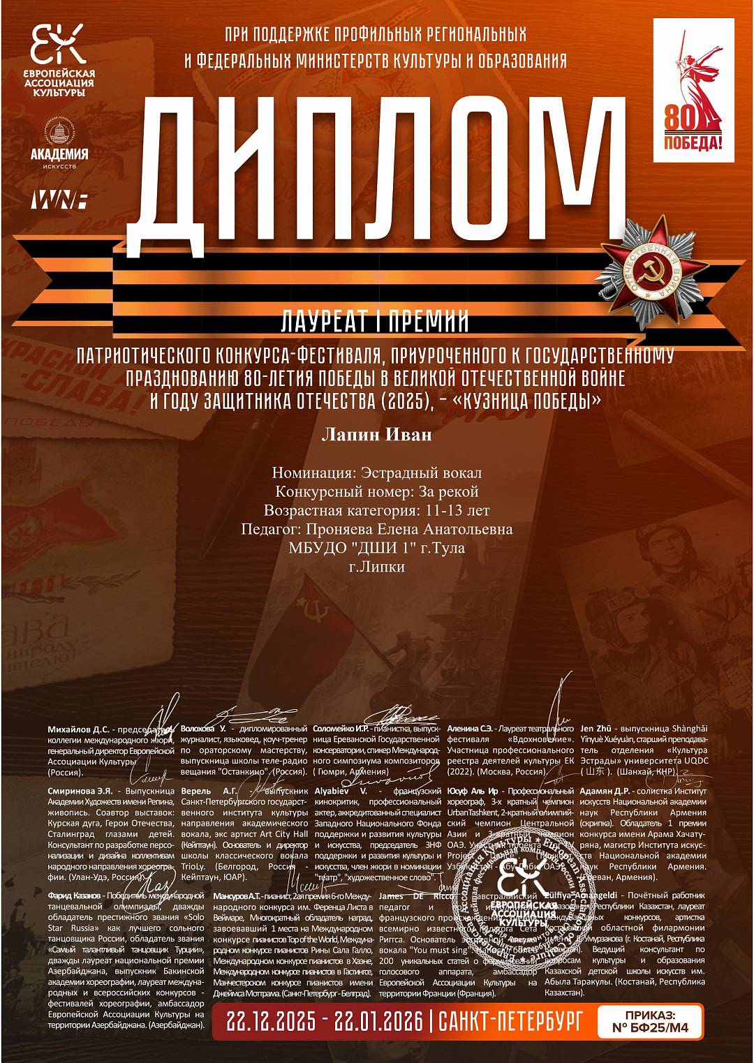 ПОЗДРАВЛЯЕМ Ивана Лапина, преподаватель Елена Анатольевна Проняева с ПОБЕДОЙ в конкурсах и фестивалях!