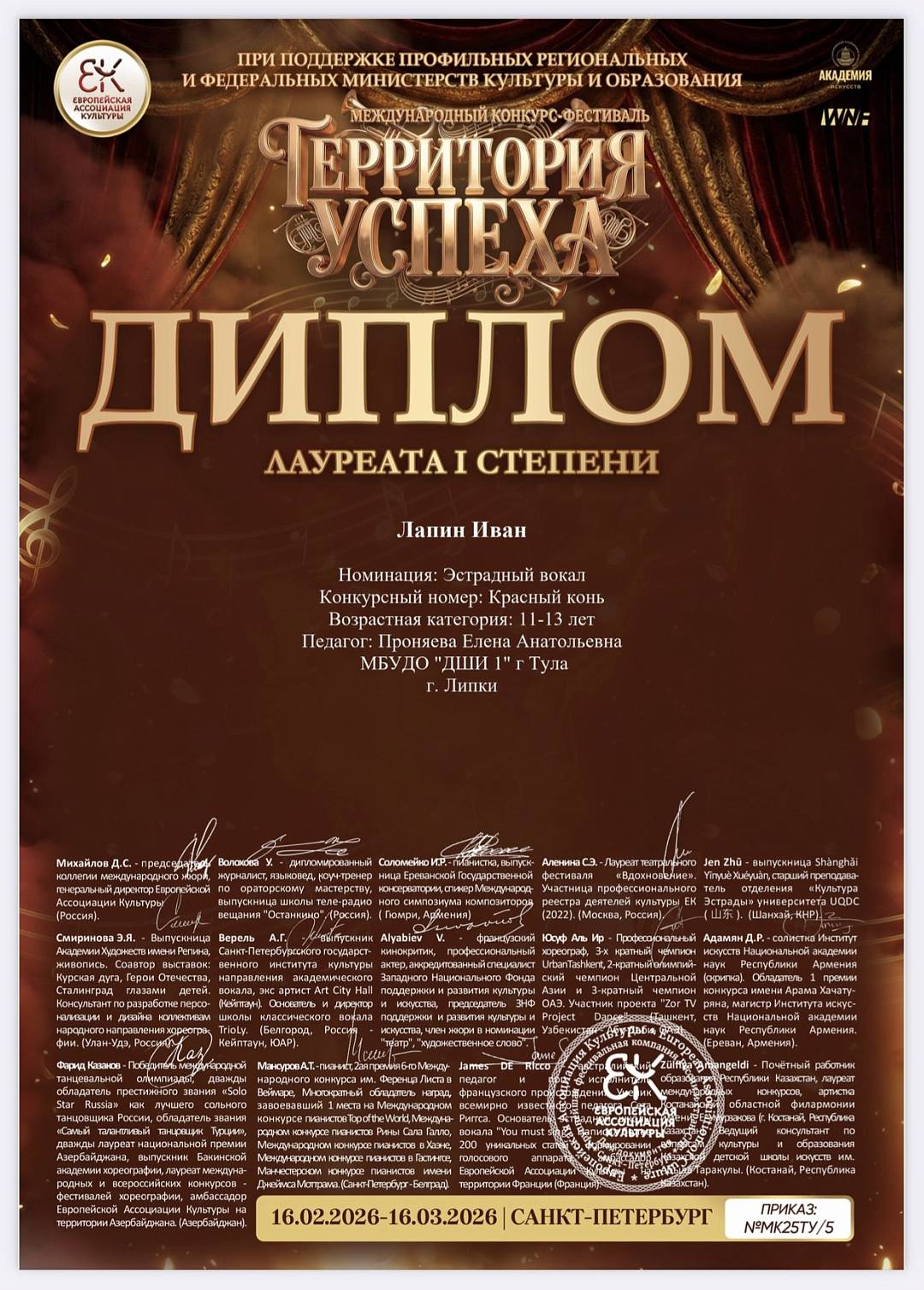 Поздравляем Ивана Лапина с победой на Международном конкурсе-фестивале «Территория успеха»!