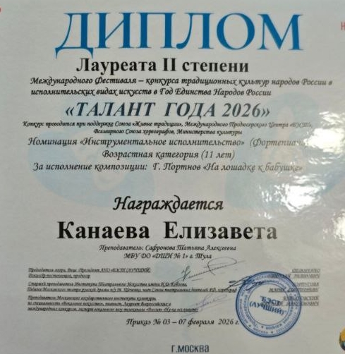 17 февраля 2026, Вторник 12:02 Просмотров: 54Поздравляем победителя (Диплом лауреата II степени) Международного фестиваля-конкурса традиционных культур народов России в исполнительских видах искусства в Год Единства народов России «Талант года 2026» Канаеву Елизавету (преподаватель Сафронова Т.А.)!