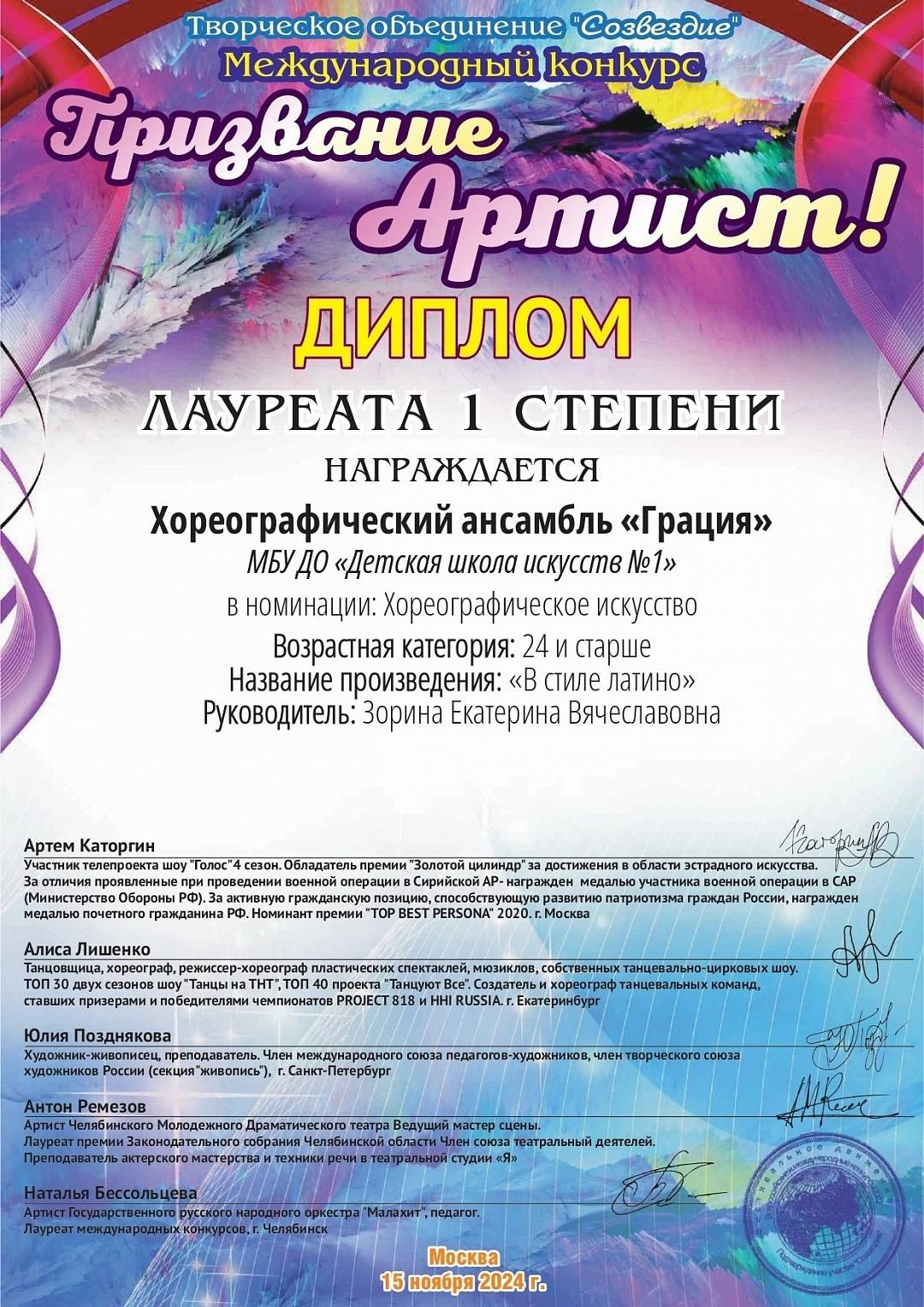 (Диплом лауреата I степени) на Международном конкурсе "Призвание