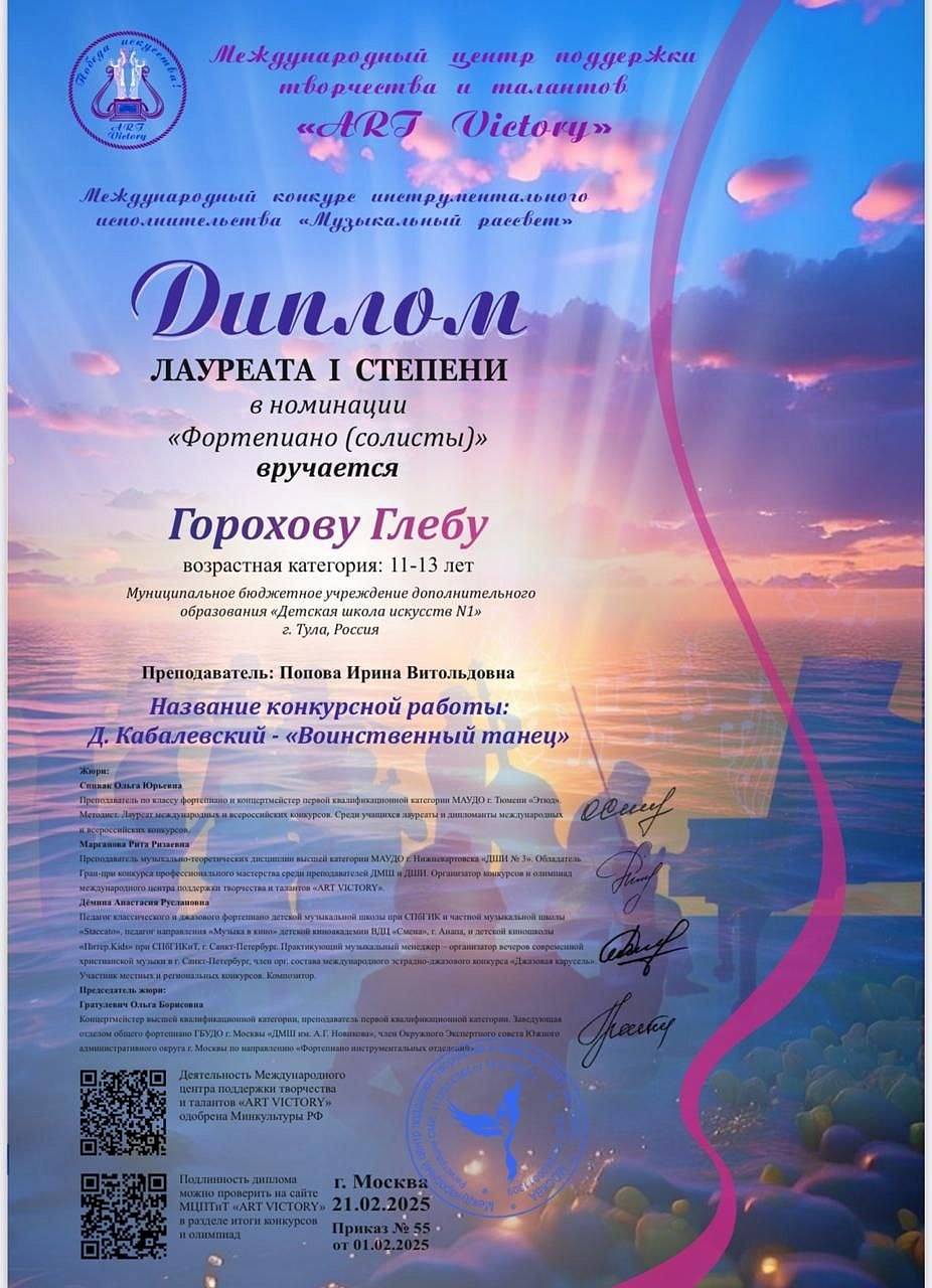 Поздравляем лауреата 1 степени Международного конкурса инструментального исполнительства "Музыкальный рассвет" Горохова Глеба
