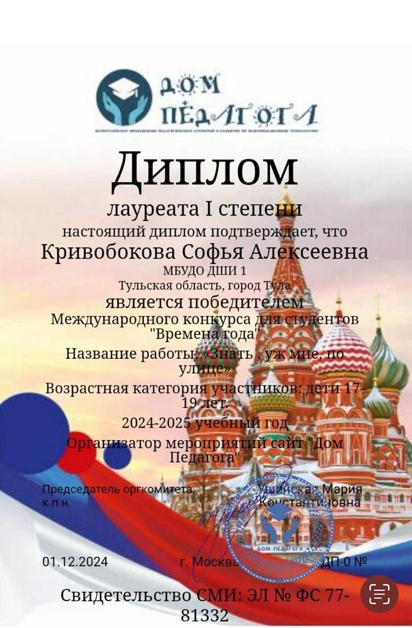 Поздравляем Лауреата 1 степени Международного конкурса "Времена года" Софью Кривобокову