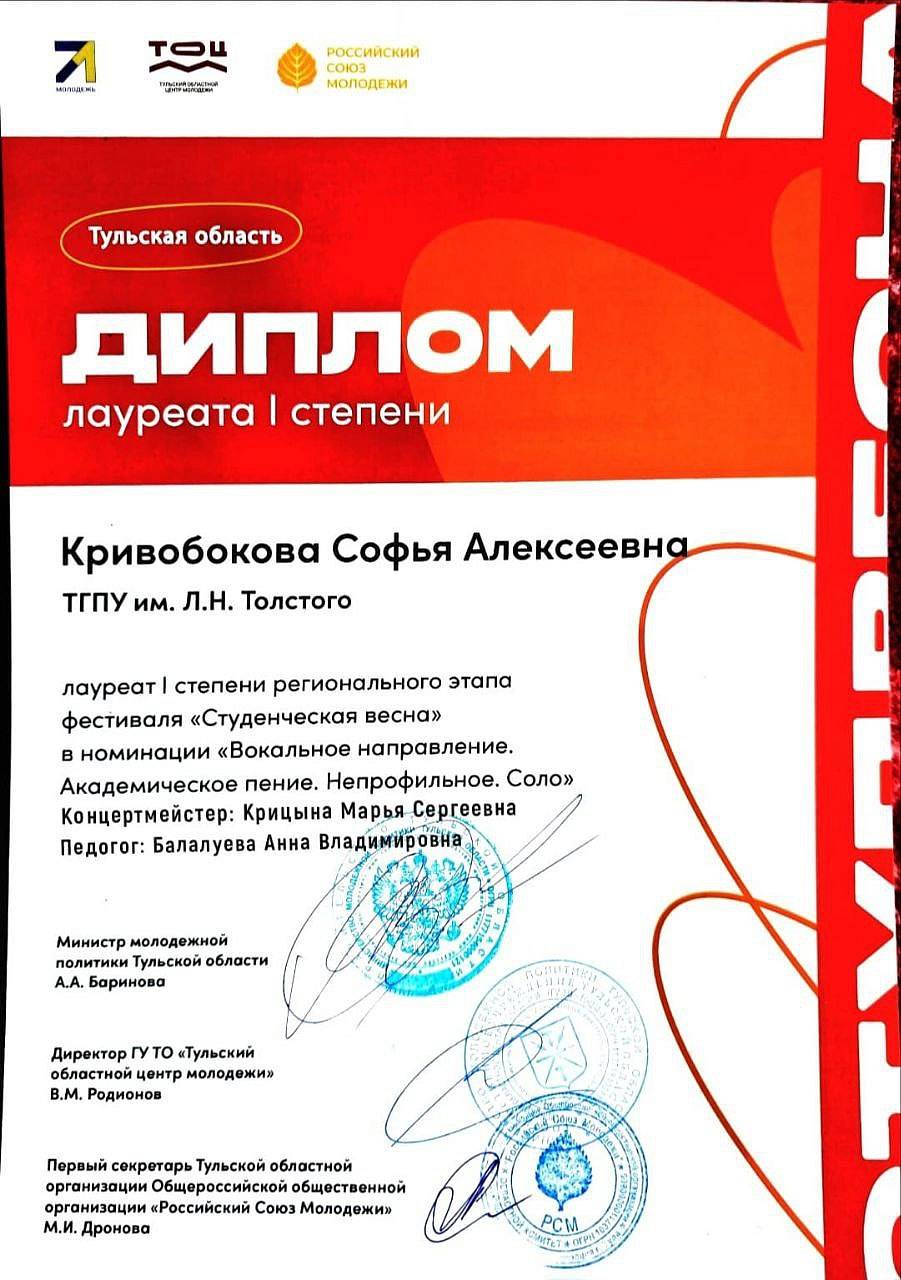 Поздравляем Лауреата 1 степени регионального этапа фестиваля "Студенческая весна" Софью Кривобокову