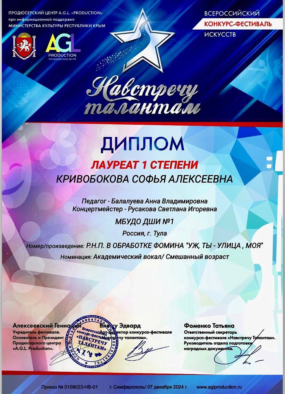 Поздравляем Лауреата 1 степени Всероссийского конкурса - фестиваля "Навстречу талантам" Софью Кривобокову