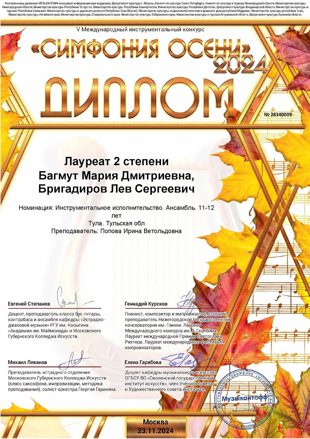 ПОЗДРАВЛЯЕМ Лауреата 2 степени V Международного инструментального конкурса "Симфония осени" фортепианный дуэт Багмут Мария и Бригадиров Лев
