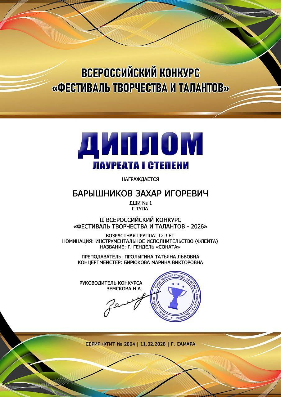 24 февраля 2026, Вторник 12:02 Просмотров: 33Поздравляем Лауреата I степени II Всероссийского конкурса "Фестиваль творчества и талантов-2026" Захара Барышникова (преподаватель Пролыгина Татьяна Львовна, концертмейстер Бирюкова Марина Викторовна)!