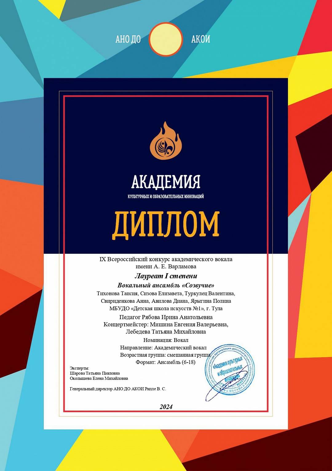 Поздравляем Лауреата I степени IX Всероссийского конкурса академического вокала имени А.Е. Варламова вокальный ансамбль «Созвучие»