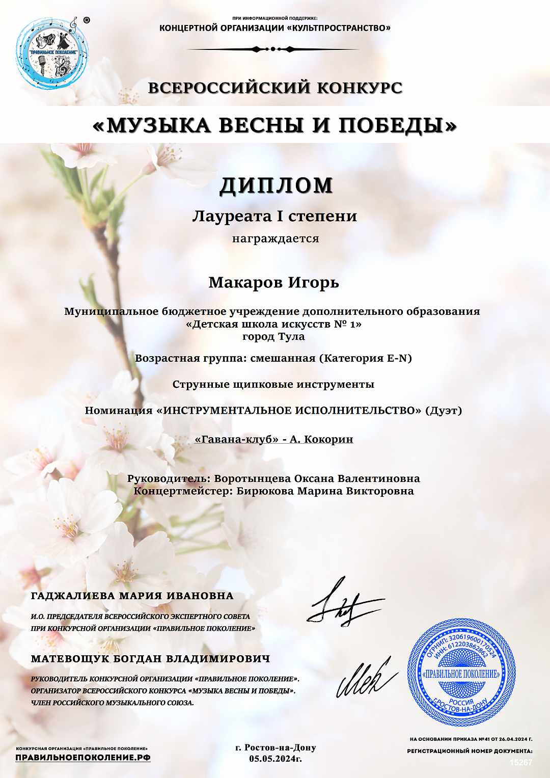Поздравляем Лауреата I степени Всероссийского конкурса "МУЗЫКА ВЕСНЫ И ПОБЕДЫ" Игоря Макарова