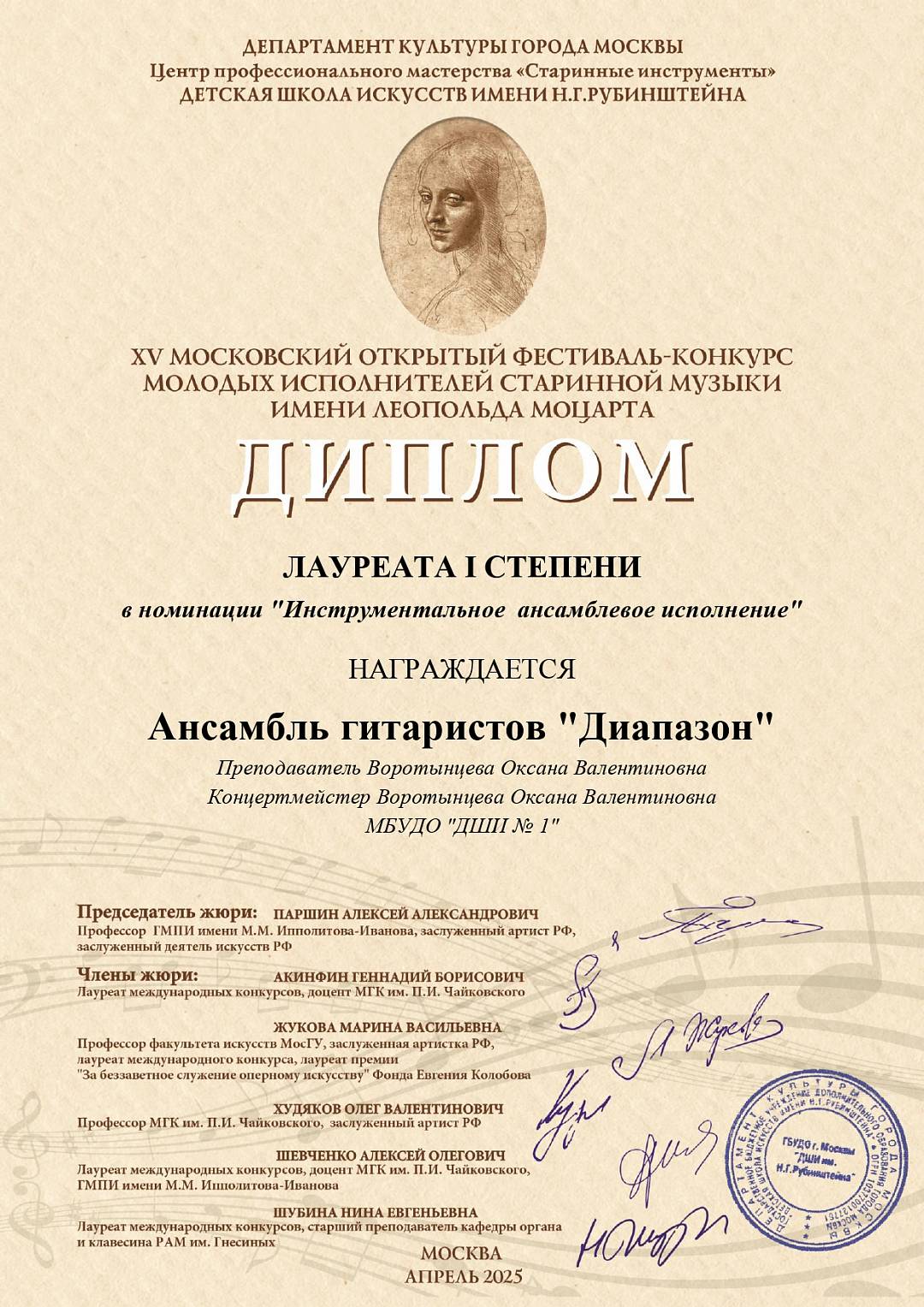 Поздравляем Лауреата I степени XV Московского открытого фестиваля-конкурса молодых исполнителей старинной музыки имени Леопольда Моцарта ансамбль гитаристов "Диапазон"