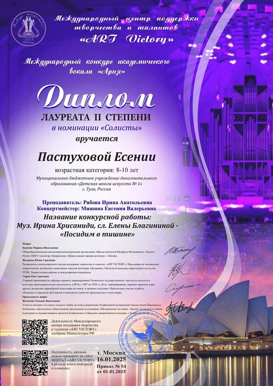 ПОЗДРАВЛЯЕМ Лауреата II степени Международного конкурса академического вокала "Ария" Есению Пастухову