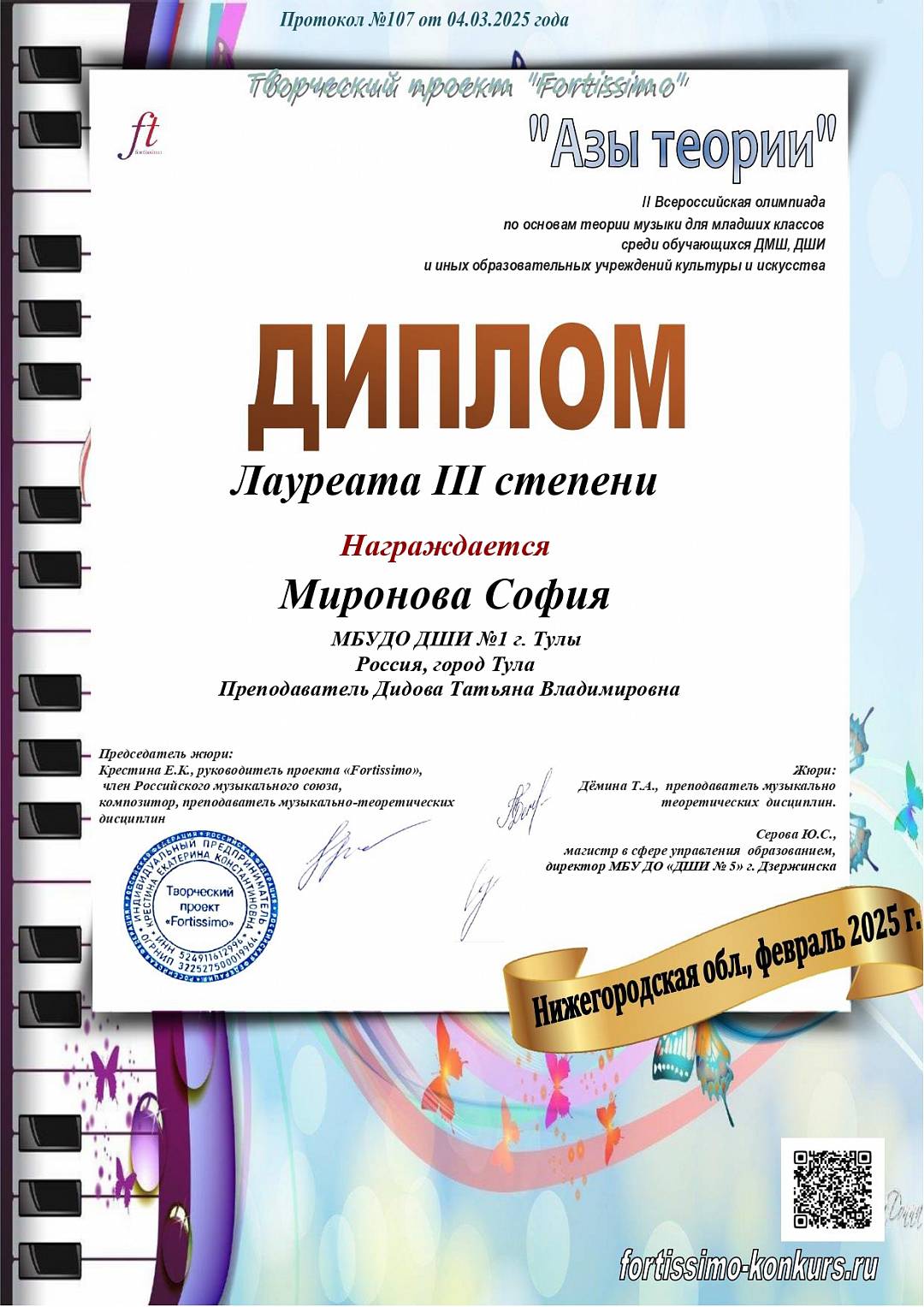 Поздравляем Лауреата III степени II Всероссийской олимпиады по основам теории музыки...
