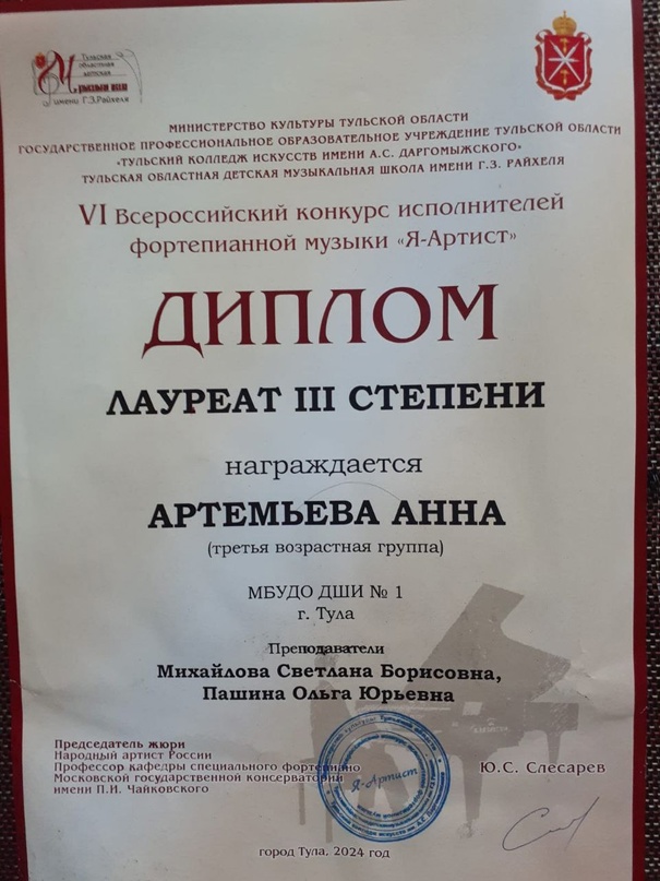 ПОЗДРАВЛЯЕМ Лауреатов 3 степени VI Всероссийского конкурса исполнителей фортепианной музыки "Я-АРТИСТ" Артемьеву Анну (преподаватель Михайлова С.Б. ) и Лыкова Григория ( преподаватель Дагаева И.Л. ) !