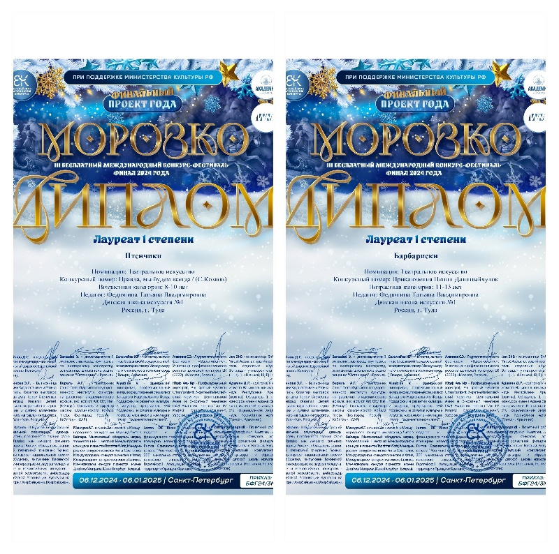 Поздравляем ЛАУРЕАТОВ I степени III Международного конкурса-фестиваля «Морозко» (Финал 2024 года) в номинации «Театральное искусство» (преподаватель Татьяна Владимировна Федюнина):