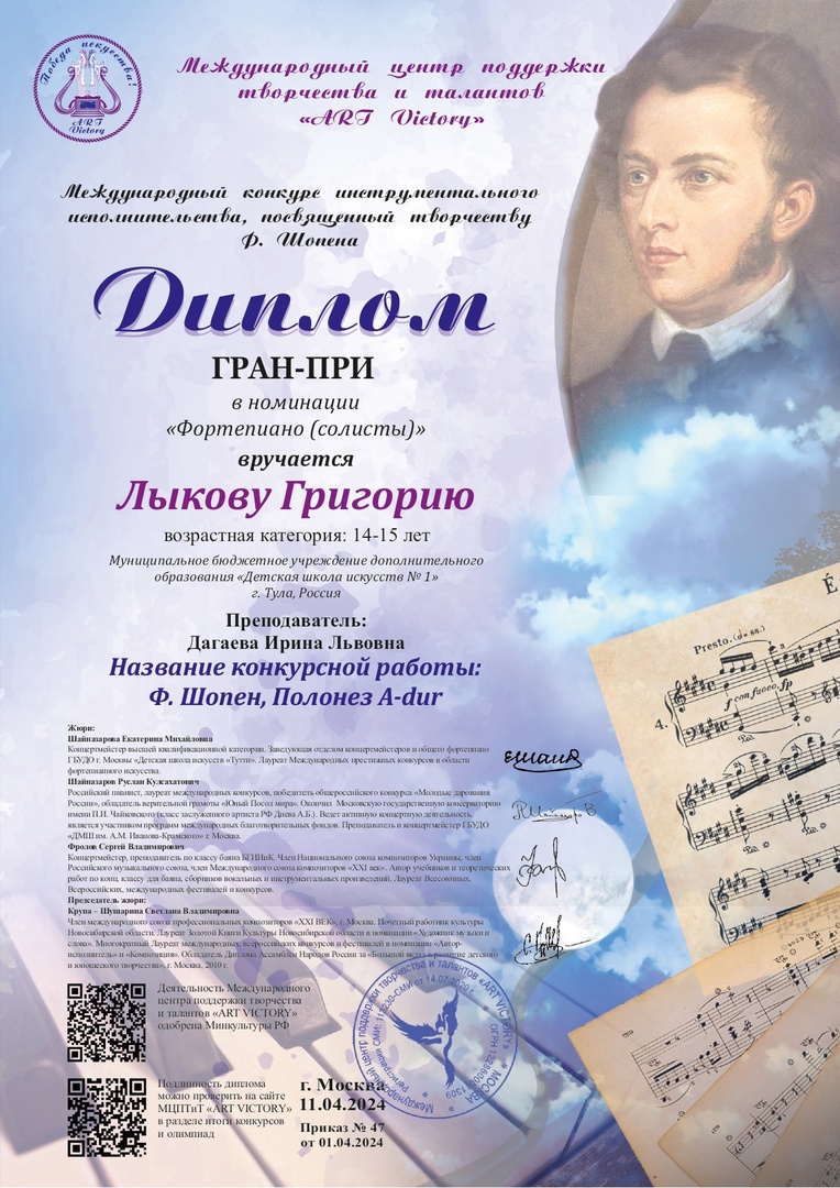 23 апреля 2024, Вторник 12:04 Просмотров: 619ПОЗДРАВЛЯЕМ обладателя ГРАН-ПРИ Международного конкурса инструментального исполнительства, посвящённого творчеству Ф. Шопена, Лыкова Григория (преподаватель Дагаева И.Л. )!