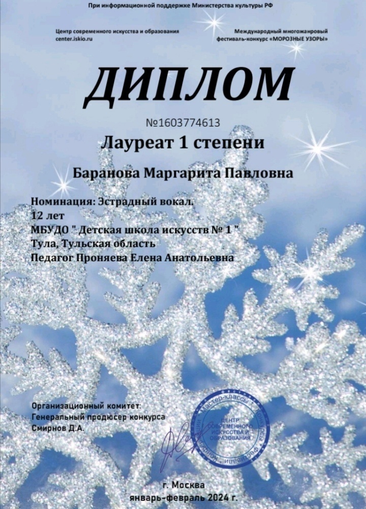 Дипломы лауреата I степени Международного многожанрового фестиваля-конкурса «Морозные узоры» и Международного конкурса «Новая звезда»!