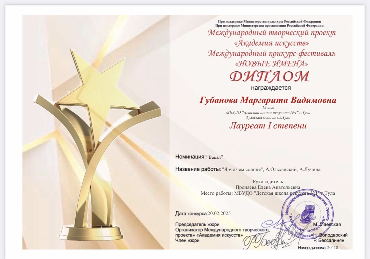Поздравляем Маргариту Губанову с Дипломом лауреата 1 степени Международного конкурса- фестиваля «Новые имена»!