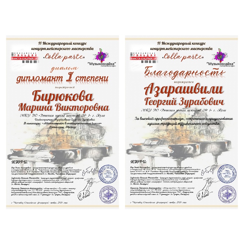 4 декабря 2024, Среда 10:12 Просмотров: 509Поздравляем Дипломанта I степени II Международного конкурса концертмейстерского мастерства «Colla parte» Марину Викторовну Бирюкову и иллюстратора Георгия Зурабовича Азарашвили!