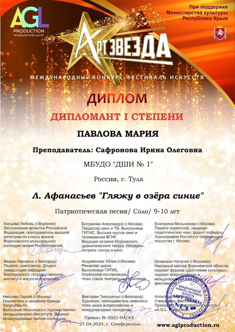 3 мая 2024, Пятница 01:05 Просмотров: 634Поздравляем Марию Павлову (преподаватель Ирина Олеговна Сафронова) с Дипломом лауреата I степени Международного конкурса-фестиваля искусств "АРТ ЗВЕЗДА"!