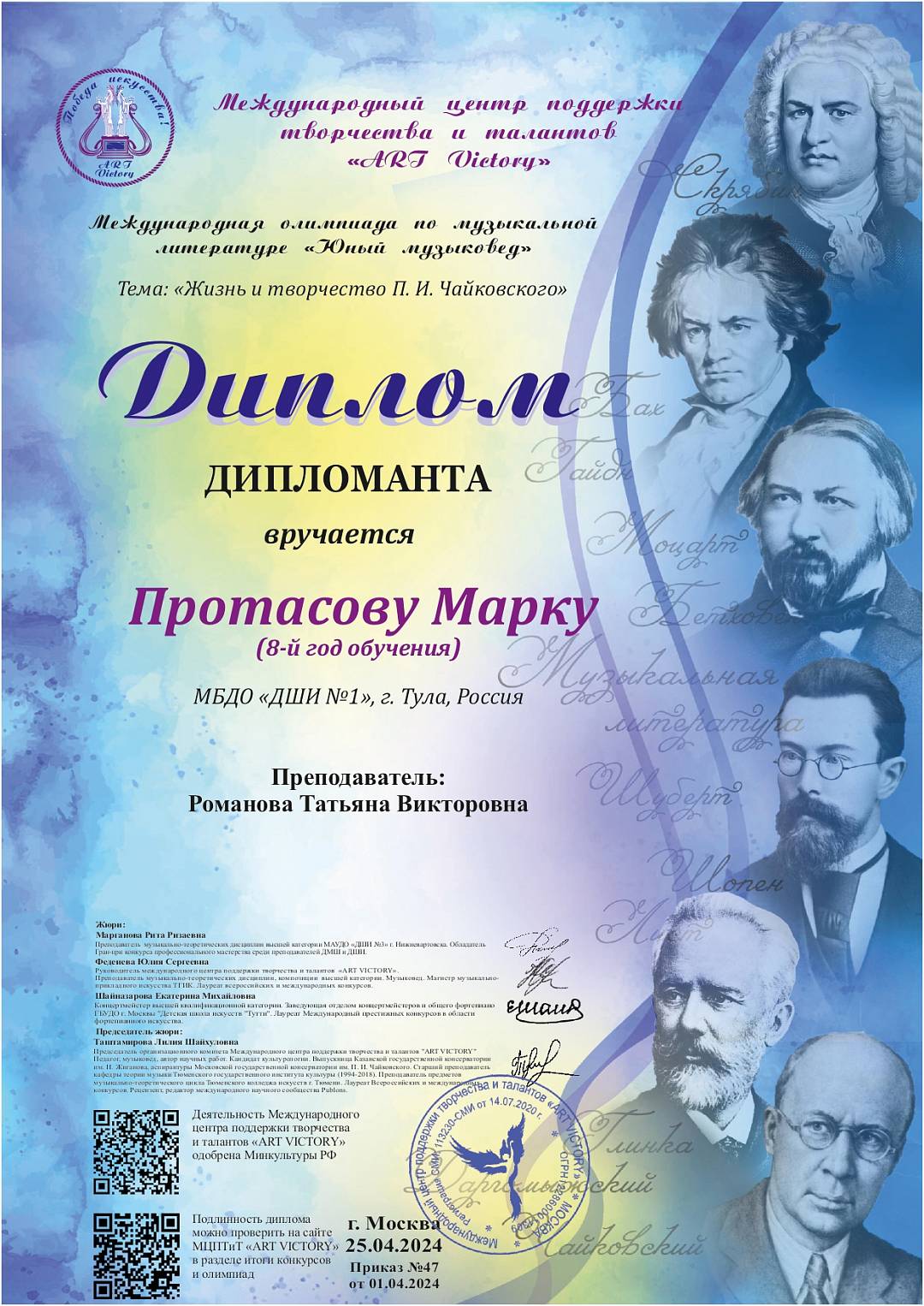 3 мая 2024, Пятница 01:05 Просмотров: 693Поздравляем Дипломанта Международной олимпиады по музыкальной литературе "Юный музыковед" Марка Протасова, преподаватель Татьяна Викторовна Романова!