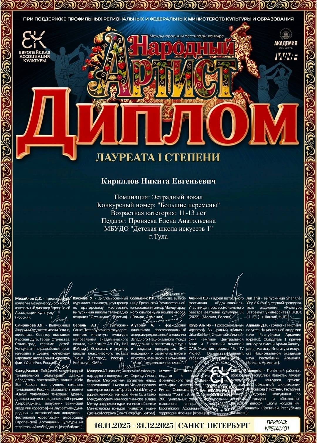 Поздравляем Никиту Кириллова - дважды лауреата 1 степени Международного конкурса «Народный артист»!